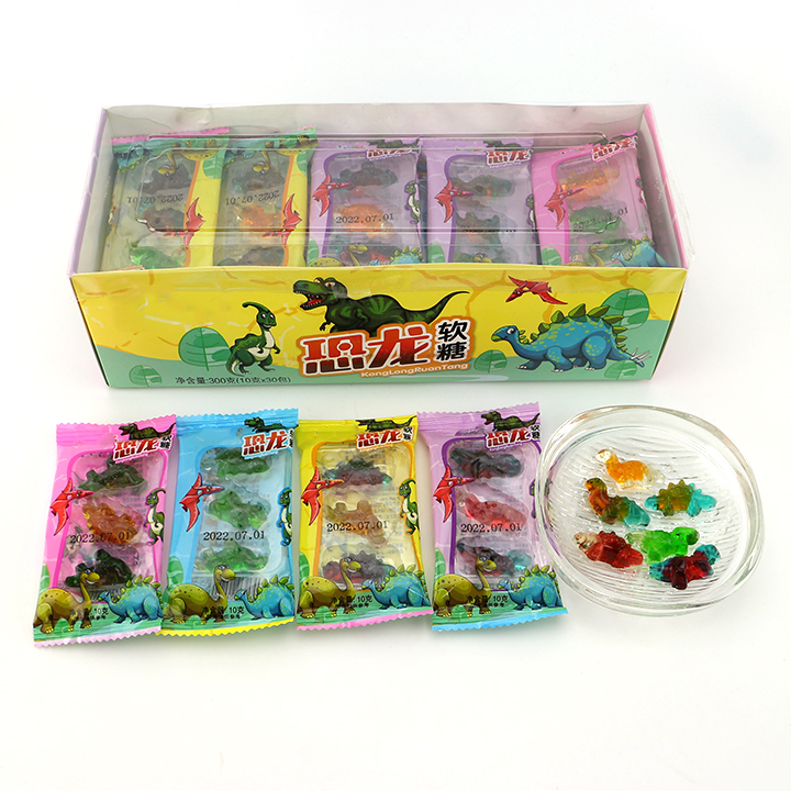ลูกอมเคี้ยวหนึบรสผลไม้ รูปทรงไดโนเสาร์ 1. 8g * 30pcs * 20boxes / ctn; 2. ขนาดกล่อง:43*26.5*43 ซม. 3. น้ำหนักรวม:7.2 กก. ต่อกล่อง 4. รส: ผลไม้ 5. ขั้นต่ำ: 500 ctns