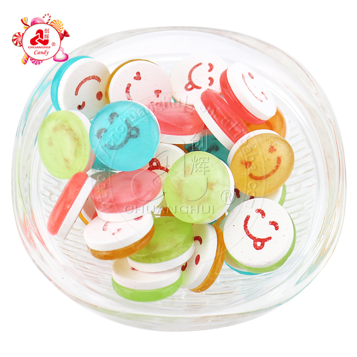 ขายส่ง 2 ใน 1 ลูกอมผลไม้แข็ง + ลูกอมกด ลูกอมหน้ายิ้มสองชั้นจำนวนมาก